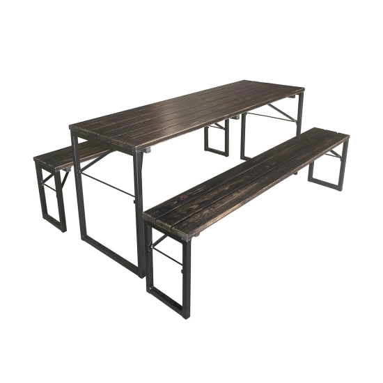 La Table Pliante "FACTORY" Premium allie robustesse et esthétique industrielle pour une utilisation professionnelle en intérieur comme en extérieur. Fabriquée en bois de pin massif européen et dotée d'une finition "Noir Vieilli" (black wash), cette table brasserie offre un style unique tout en assurant une grande stabilité. Son piètement pliant en métal noir permet un rangement facile, avec des tasseaux intégrés pour un empilage sans friction.