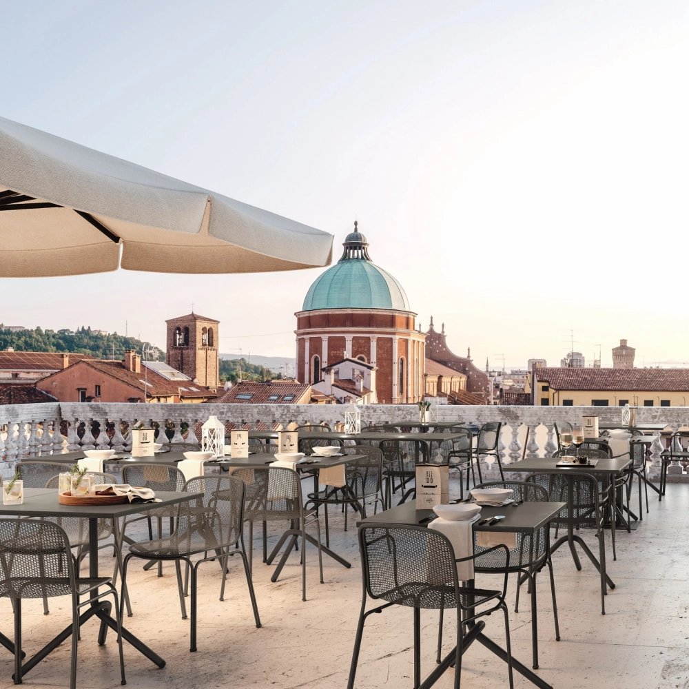 La table BARI se marie parfaitement avec les chaises et fauteuils CAPRI en résille métallique, créant ainsi un ensemble harmonieux et fonctionnel pour votre espace de restauration en plein air.