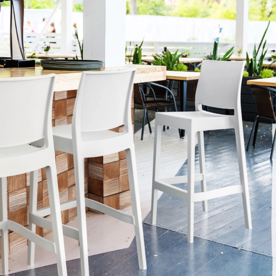 La Chaise de bar Nova se distingue par son design contemporain, sa robustesse et sa praticité, répondant aux exigences des environnements professionnels et résidentiels, en intérieur comme en extérieur.