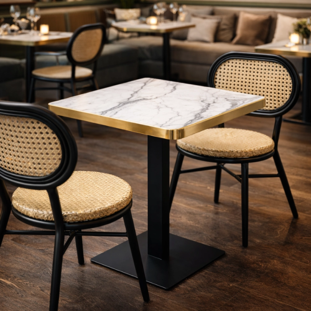 Disponible en marbre blanc ou noir avec finition texture pierre, il est idéal pour un usage intérieur dans les restaurants, cafés ou bars.